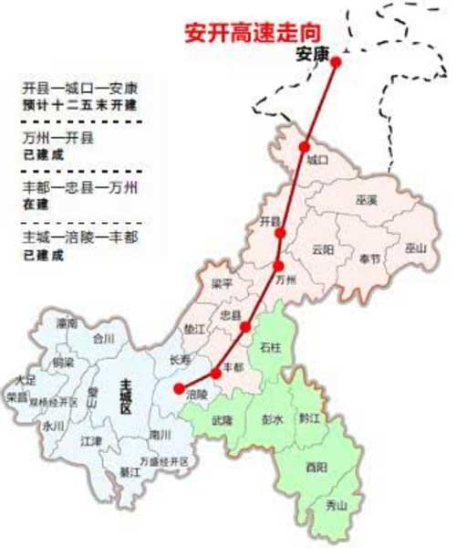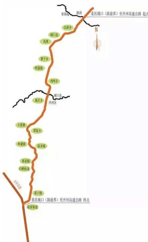 城开高速公路即重庆市城口县至开州区的高速公路,是国家高速G69银百高速公路(银川至百色)的一段,线路全长129.3公里,桥隧比81%,设计时速为80公里,双向四车道,总概算约234亿元。线路起于开县赵家坝,接开万高速公路,经渠口镇、白鹤、温泉、和谦、谭家、大进、双河口,穿满月特长隧道,至城口鸡鸣,经廖子到城口,跨任河至白屏乡,穿心店过大巴山特长隧道至渝陕界。设收费站11处、互通式立交11处、服务区2处、停车区2处。