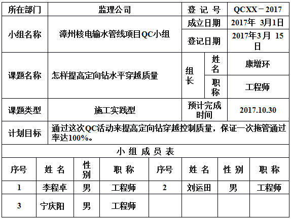 当一个好的方案、方法出来的时候,对效果的巩固很重要,即标准化、制度化。对此制定了与之对应的标准化的表格。使操作人员和监理人员在施工和监理过程中能够将QC小组的成果巩固下来,并且制定针对五个问题的专门巩固措施,进一步制定了定向钻施工HSE检查表。3个中间验收表格,三个批记录验收表,巩固了QC成果。