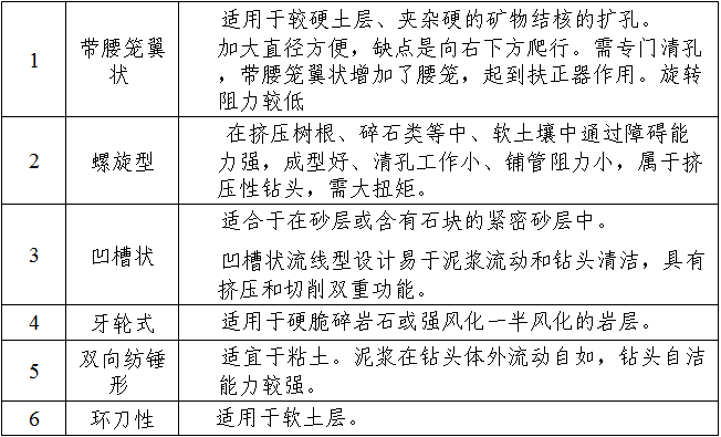 5)选择葫芦形、双向纺锤形钻头,不使用翼状钻头(翼状钻头前进时向右下方爬行,使钻孔弯曲,适合于较硬地层,)。如弯曲较明显,用环刀再修复。