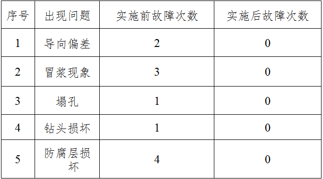 通过这次活动,使在海峰村、下径村段的定向钻施工中拖管一次通过率达到100%,出土点偏差不大规定20mm, 导向孔曲线偏差均在允许范围内,没有因为导向错误造成废孔,防腐层没有破损,由于及时更换钻头,没有出现钻头损坏现象,达到了预期效果,由于泥浆配比及泥浆泵操作规范化,没有了冒浆、塌孔现象,使周围的施工环境有了极大的改善。列表如下: