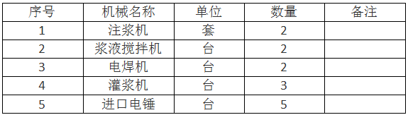 PO42.5普通硅酸盐水泥、化学浆液(如:硅酸钠(俗称水玻璃),丙烯酸盐灌浆料)、灌浆机、压浆机、制浆机、电焊机等。