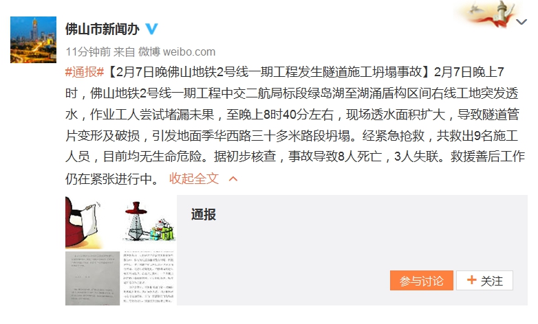 据佛山市政府新闻办公室官方微博消息,2月7日晚上7时,佛山地铁2号线一期工程中交二航局标段绿岛湖至湖涌盾构区间右线工地突发透水,作业工人尝试堵漏未果,至晚上8时40分左右,现场透水面积扩大,导致隧道管片变形及破损,引发地面季华西路三十多米路段坍塌。